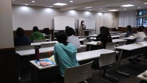 会場の “かたらいの道 市民スペース” は三鷹駅前で行き交う人が多い場所にあり、感染症対策のため窓を開放しての講義でしたので、お子さんの泣き声にハラハラしたり、傘を差す人を見つけて雨が降り始めたことを知ったりして、街の賑わいを感じながら講義は進みました。隣接する自転車置き場が満車なことも多くご不便をおかけした場面もありましたが、事故もなく 無事日程が終了しました。